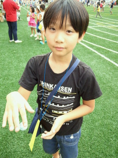 だって写真編集したりするの面倒なんだもん・・・。 というわけでもう10月も終わるというのに9月29日に開催されたこうたんの運動会の話題です。 3年生のこうたんの種目はまず、「ビバ!ハリケーン」。 昔風にいうと「台風の目」ってやつです。 やってることは同じでも名前が今風ですね~。 とっても楽しそうにやってます。 さて次は80m走。 3年生からはコーナーがあります。 練習の時から「絶対に1番にはなれないから。」とか 「いつも2位なんだよね~」と言っていたこうたん。 前日の夜になって「どうやったら早く走れるの?」と聞いてきました。 もう手遅れだと思いますが、とりあえず頑張って! 結果は・・・。 残念ながら3位でした。 途中、応援するばあば達と目があったとか?! 敗因は大きすぎる声援ですかね・・・。 お昼を食べてからはダンス。 今年はオリンピックイヤーだったので、5色のポンポンを持って踊りました。 これも楽しそうに踊ってます。 最後は五輪の形を作ったのですが、横からじゃあ全然わからなくて残念。 何はともあれ雨も降らずに無事に終了しました~。 みなさまご声援お疲れ様でした!
