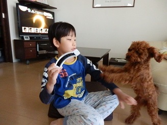 なので、パジャマでゆっくり観察です。 日食グラス越しにデジカメで撮ってみました。 でも残念ながら肝心の金環日食は暗すぎて撮れませんでした・・・。 ところで、日食中に動物にどんな変化があるのか?というわけで観察してみました。 いつものように餌くれダンスしかしていません・・・。 まだ夢の中のようです・・・。 どうやら全く影響はなかったようです。 相変わらずこうたんとナッツ、楽しそうですね~。 ナッツに日食グラスをかけさせようとしているこうたんでした。 忍者ブログ [PR]