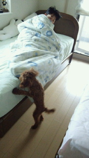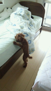 7時過ぎになると目覚ましで起きないこうたんを起こしに行きます。 でも本当の狙いはスヌーピーのぬいぐるみ。 途中から助走をつけてもうダッシュでジャンプ! まだ乗れませんがそのうちベッドにも乗っちゃいそうですね~。