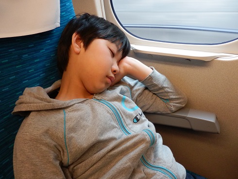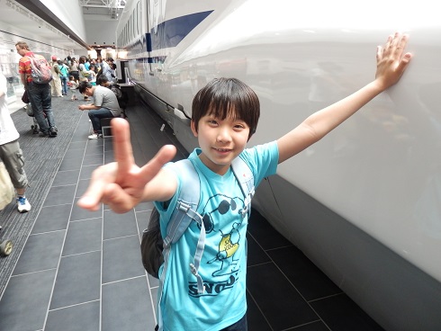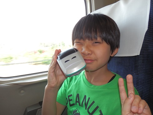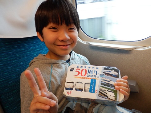 今日は特別予定もなかったので、お土産を買いに地下街をぶらぶらしたり、デパートに行ったりしました。 こうたんは自分のお土産?にあっちこっちでNゲージを探しましたが残念ながら欲しいものは見つかりませんでした・・・。 なので珍しくおもちゃを買わない旅行となり、こうたんとしてはちょっと残念そう。 少しは大人になったってことかしら?! で、帰りの新幹線は新型のN700A。 もちろん駅弁を買って乗り込みます。 東海道新幹線50周年記念弁当! 乗り込んだのが1時過ぎだったので、早速いただきます。 そしてお腹もいっぱいになり、お疲れなのか寝ちゃいました。 楽しかった夢でも見てるんでしょうかね~。 おしまい!