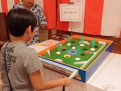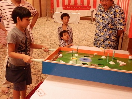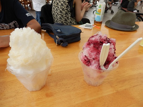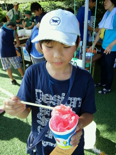 この日は午前中に塾の模試があったのですがお祭りは午後2時からだったので、セーフ。 吹き矢をやったり、スーパーボールすくいをやったり。 もちろんただで遊べます。 今日はとっても暑かったのでかき氷が大人気。 こうたんはもちろんいちご味。 その後、ウォーターガンでコップを落とすのに水圧が弱く一苦労。 ガシガシ空気を入れないとだめなんだけどこうたんは2、3回しかやらないから・・・。 こういうところに性格出ますね~。 戦いごっこ嫌いのこうたん。 その後またかき氷を食べて、ヤクルトを飲んで、ママは夕飯にコロッケを買って帰ってきました。 とっても暑い中疲れました~。 お手伝いのお母さん方もお疲れ様でした。 そしてこの猛暑のなか朝4時に家を出てゴルフに行ったパパもお疲れ様でした~。