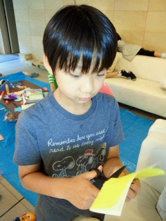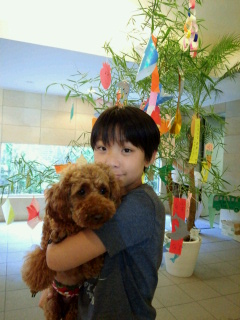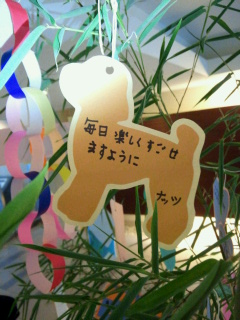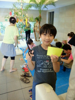 今年はパパが理事長ということもあり、初めて参加してみたこうたん一家。 というか、パパは監視係。 全く誰がどこの子かわからなかったそうです・・・。 女の子は学年が違ってもみんなで仲良く楽しそうにいろいろ作ってますが男の子はほとんど参加してません・・・。 こうたんとナッツは終わりのほうにちょこっとだけ参加。 人が減ってきたので 折り紙を切って 飾ってみました。 が、ひもを結べずに落ちました・・・。 男の子って・・・。 ナッツのお願い事。 代筆こうたん。