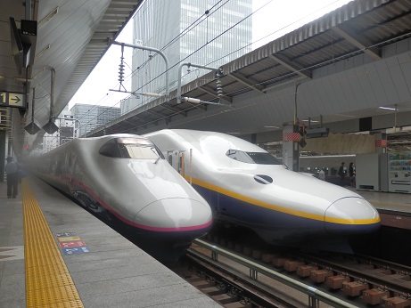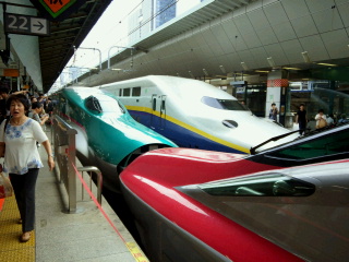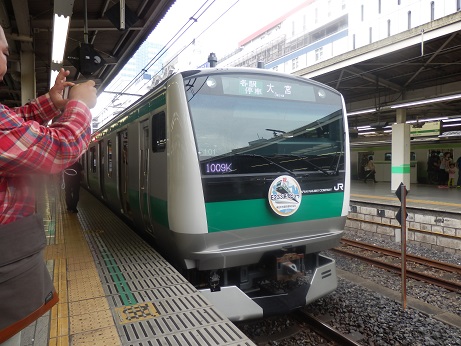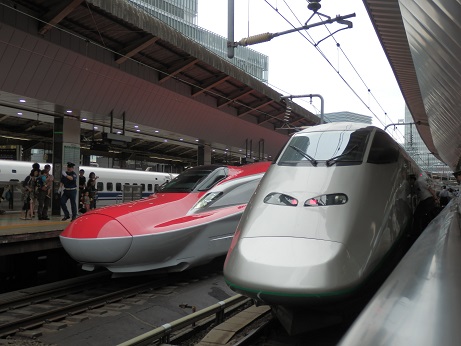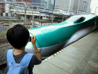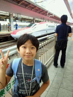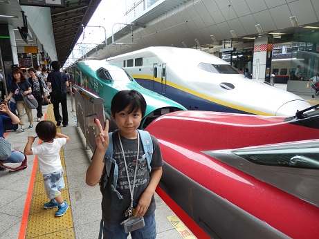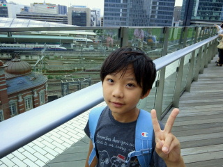 というわけでこうたんと東京駅へ新幹線を撮りに行ってきました~ まずは池袋駅でスペーシアを激写。 成田エクスプレスが並んでいるのもシャッターチャンスだそうで。 そうこうしているうちにデビューしたばかりの埼京線がやってきました。 もちろんヘッドマークも忘れずに。 興奮さめやらぬまま、次は山手線で東京駅に移動します。 新幹線のホームに上がったとたんE5系新幹線が停車中でまたまた大興奮のこうたん。 そして今日の目的のE5系とE6系連結の新幹線がやってきました~。 そして長いホームを前に後ろに走る走る! とうとうこうたん行方不明に・・・。 と思ったら先頭で写真撮ってました・・・。 まあ、ここで迷子になっても絶対帰れますので心配はしていませんが! その後も次々とやってくる新幹線をホームを撮りまくり やっと満足したのかE5系を見送り ホームを後にしました。 そして、以前にパパと新幹線を見たという、KITTEという新しいビルの屋上に向かいます。 せっかくなので、観光記念に一枚。 これがKITTEね~。 ここの屋上からまた新幹線を見て、 記念撮影して 場違いなこうたんとKITTEの中でお昼を食べて帰ってきました。 あ~、疲れた~。 これで夏休みの絵日記書けないかしら~?